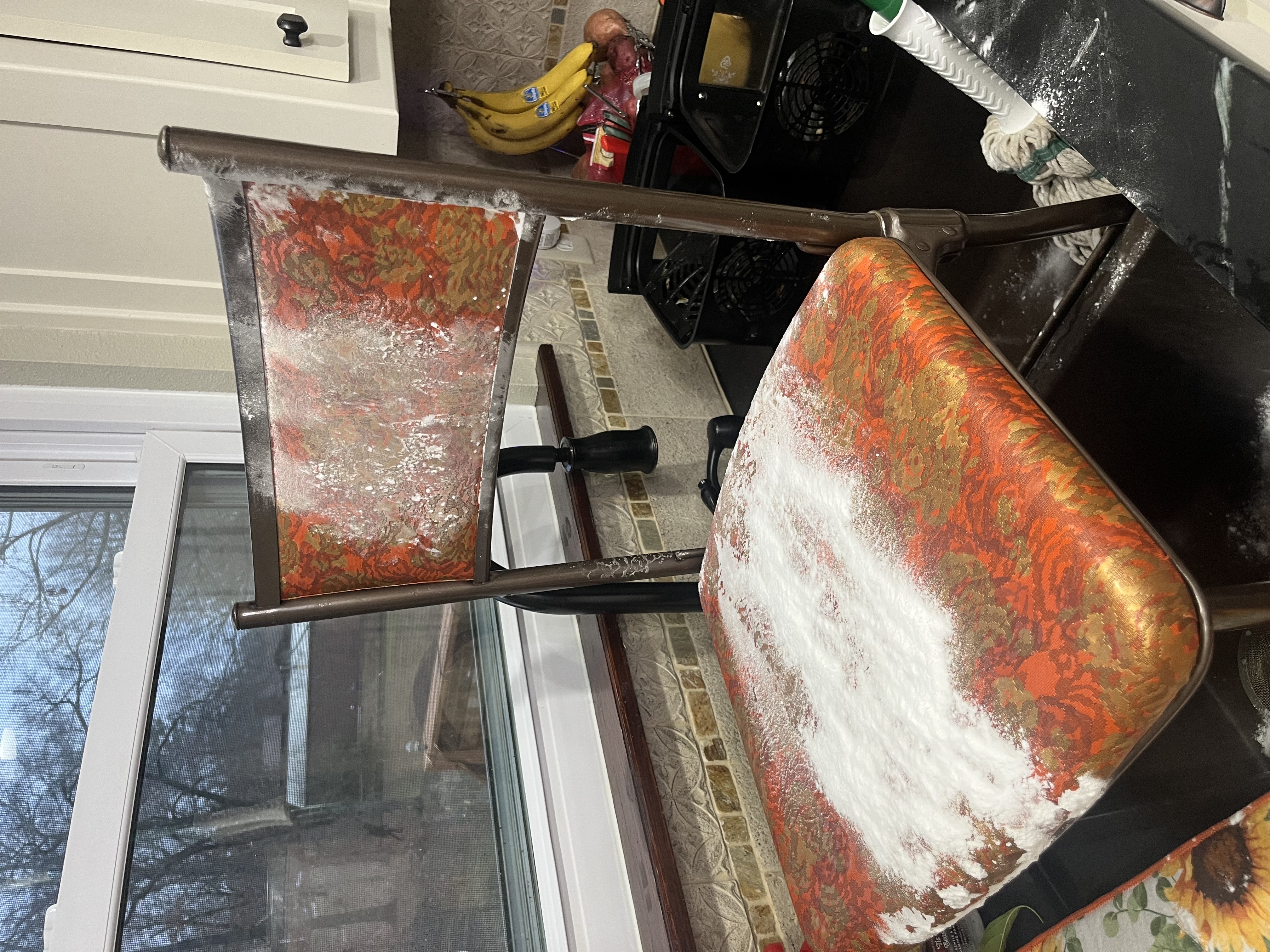 But wait, there’s more. To my horror, that extra laundry soap I bought was lying on its side in the cabinet above my washing machine. The lid wasn’t tightened on it, so it leaked down the shelves, down the wall, and onto a card table and chairs that I store beside my washing machine.